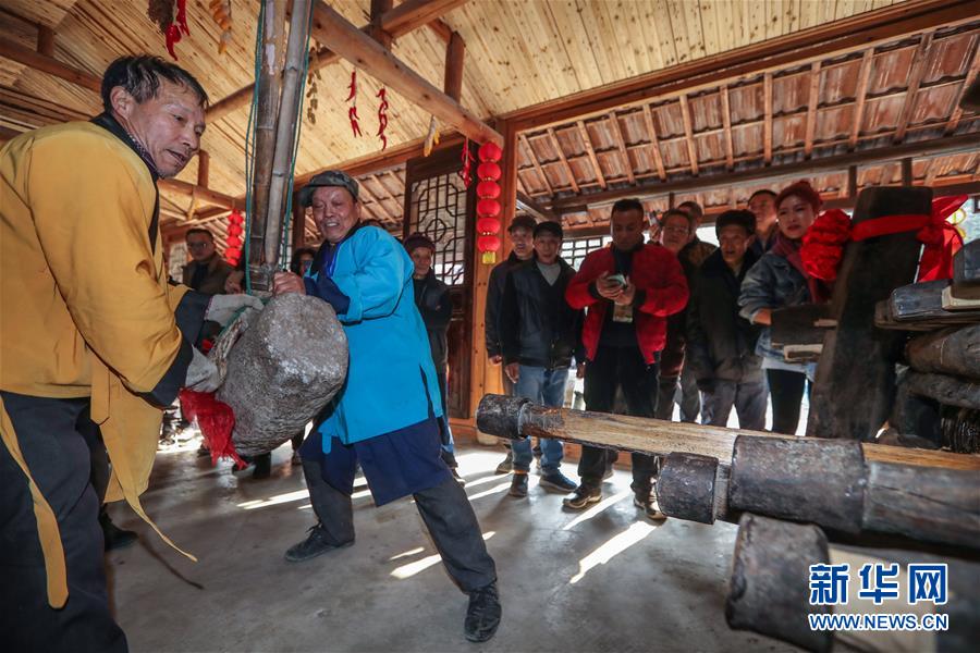 12月15日,工作人員在老油坊內(nèi)通過(guò)撞擊的方式將不同尺寸的木楔插入木龍,進(jìn)而榨出茶餅中的茶油。 新華社記者 徐昱 攝