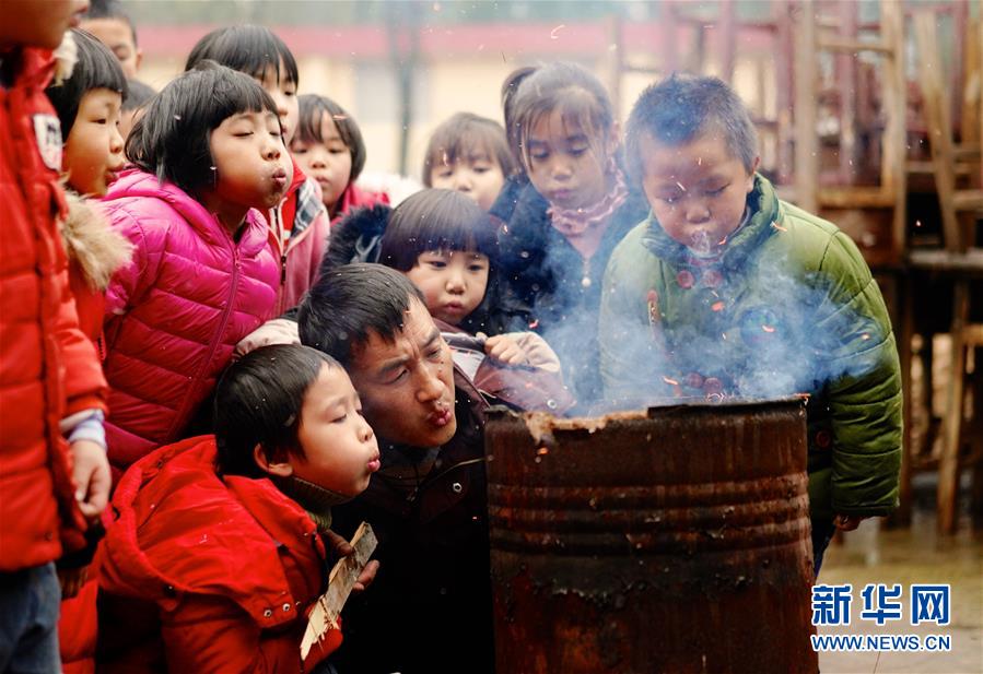 1月3日,在江西省鷹潭市余江區(qū)春濤鎮(zhèn)黃泥小學(xué),老師章站亮(前右)和學(xué)生們一起生火。由于生火用的材料均是廢棄的桌椅或者枯葉,點(diǎn)火后得不停地靠嘴吹氣才能燒得旺盛。2018年9月,44歲的章站亮來(lái)到黃泥小學(xué)擔(dān)任校長(zhǎng),黃泥小學(xué)物質(zhì)條件艱苦,沒(méi)有食堂。他每月自費(fèi)買菜為孩子們義務(wù)加餐,被孩子們稱為“廚神爸爸”。新華社記者胡晨歡攝