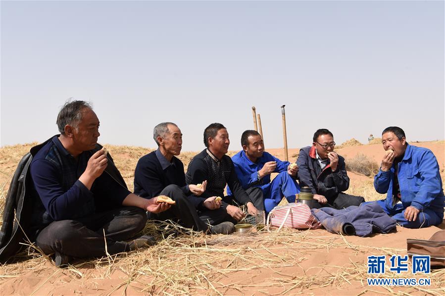 在甘肅省古浪縣境內(nèi)的黑崗沙風(fēng)沙口,八步沙第二代治沙人賀中強(qiáng)(左一)、郭萬(wàn)剛(左二)、石銀山(左三)、羅興全(右三)、程生學(xué)(右二)、王志鵬(右一)在休息間隙吃午飯(3月26日攝)。二十世紀(jì)八十年代,八步沙是騰格里沙漠南緣甘肅省古浪縣最大的風(fēng)沙口。當(dāng)?shù)亓荒挲g加在一起近300歲的老漢,在承包沙漠的合同書(shū)上按下手印,誓用白發(fā)換綠洲。38年過(guò)去,六老漢只剩兩位在世。