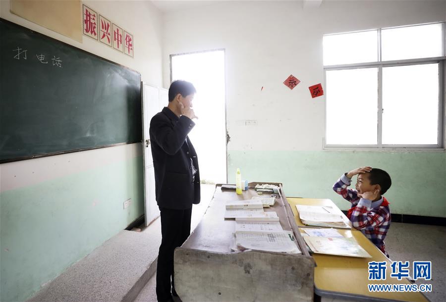 5月8日,王北海(左)在教室內(nèi)為陳威宇講解“打電話”的流程。江西省瑞金市大柏地鄉(xiāng)三河小學(xué)坐落于大山深處。陳威宇是學(xué)校里唯一的學(xué)生。陳威宇今年9歲,家庭貧困,上學(xué)不便。為解決這一難題,當(dāng)?shù)卣疀Q定恢復(fù)陳威宇家附近三河小學(xué)的辦學(xué)工作,今年46歲的王北海被安排為專(zhuān)職教師,從周一至周五,王北海幾乎每天24小時(shí)陪伴在陳威宇身旁,既當(dāng)老師也當(dāng)“家長(zhǎng)”,照料他的學(xué)習(xí)和生活。新華社記者蘭紅光攝
