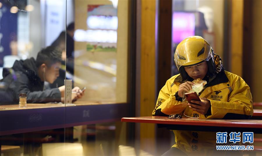 1月27日晚,送餐的間隙,來(lái)自湖南岳陽(yáng)的“外賣(mài)小哥”丁鴻在一家餐廳外一邊啃面包一邊看手機(jī)。臨近春節(jié),萬(wàn)家團(tuán)圓,而城市里的外賣(mài)配送員仍然騎行在街頭巷尾,將美食和春節(jié)祝福一起準(zhǔn)時(shí)送達(dá)。新華社記者李尕?cái)z