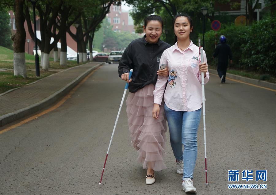5月17日,在南京特殊教育師范學(xué)院,周文晴(右)和鄔逸帆走在校園內(nèi)。1997年出生的鄔逸帆和1998年出生的周文晴都是從小失去視覺(jué)。她們學(xué)習(xí)努力,相互幫助,大學(xué)生活和同齡人一樣豐富多彩。新華社記者季春鵬攝