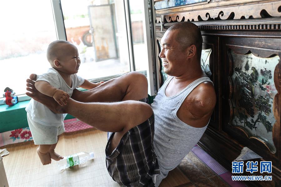 8月8日,王剛與兒子“肉肉”在家中玩耍。33歲的王剛來(lái)自遼寧省鐵嶺市昌圖縣兩家子鎮(zhèn)河西村。作為父親,王剛雖然沒(méi)有堅(jiān)實(shí)的臂膀去擁抱自己的孩子,但他一直努力用自己的方式呵護(hù)照顧家人?!盁o(wú)臂爸爸”的父愛(ài)給很多人帶來(lái)了力量和鼓舞,被人親切地稱(chēng)為“最強(qiáng)爸爸”。新華社記者潘昱龍攝