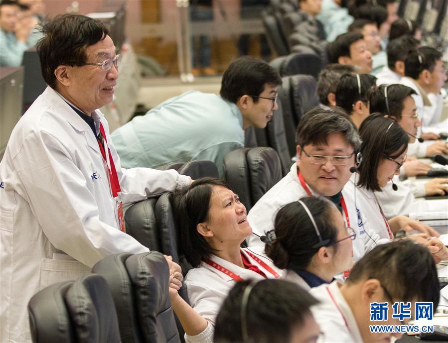1月3日,嫦娥四號(hào)成功落月的那一刻,74歲的中國(guó)航天科技集團(tuán)五院深空探測(cè)和空間科學(xué)首席科學(xué)家、嫦娥一號(hào)衛(wèi)星總設(shè)計(jì)師葉培建院士(左一)靜靜走到嫦娥四號(hào)探測(cè)器項(xiàng)目執(zhí)行總監(jiān)張熇的身后,對(duì)她表示祝賀和鼓勵(lì)。兩代“嫦娥人”的手緊緊握在了一起。新華社記者金立旺攝