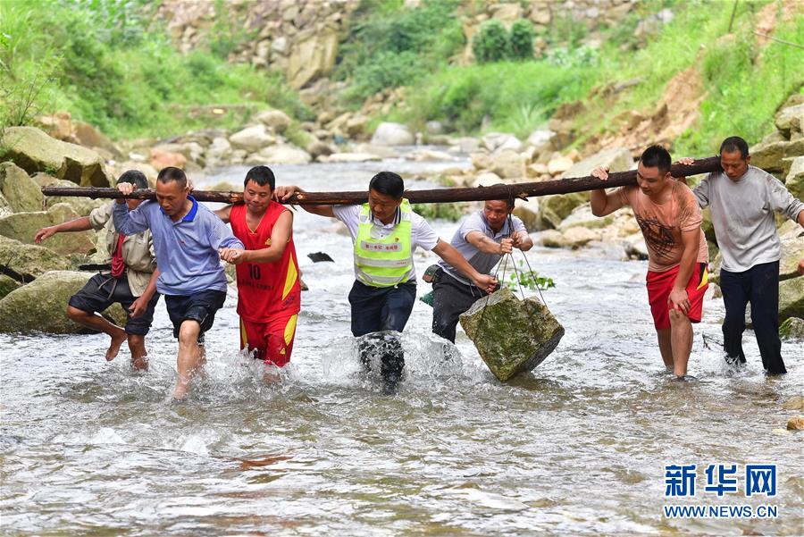 在位于黔桂交界的烏英苗寨,駐村第一書(shū)記韋桂華(右四)、黨員梁成兵(右三)、梁志新(左二)帶領(lǐng)村民維修河堤(6月30日攝)。烏英苗寨聯(lián)合黨支部在各項(xiàng)工作中積極發(fā)揮引領(lǐng)作用,帶領(lǐng)群眾穩(wěn)步走在脫貧致富的道路上。新華社記者黃孝邦攝