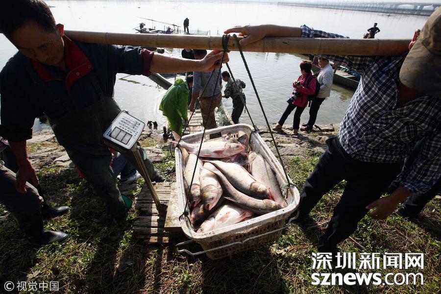 江蘇揚(yáng)州,漁夫?qū)Ⅳ~撈出過秤。