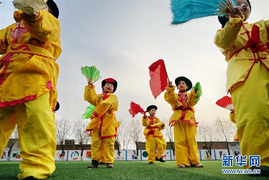 12月19日,河北省灤州市小閆營小學(xué)學(xué)生在排練地秧歌。