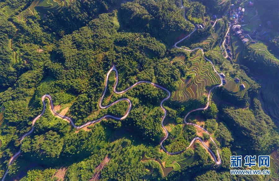 這是融水苗族自治縣桿洞鄉(xiāng)歸江村的村屯公路(6月19日無人機(jī)拍攝)。新華社記者黃孝邦攝
