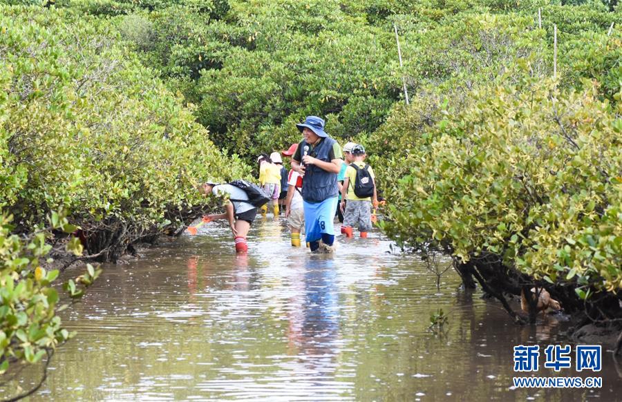 海南東寨港國家級自然保護(hù)區(qū)林業(yè)工程師馮爾輝(前)在保護(hù)區(qū)內(nèi)為學(xué)生進(jìn)行講解(7月16日攝)。 馮爾輝2009年大學(xué)畢業(yè)后來到保護(hù)區(qū)工作,小時(shí)候他家就住在紅樹林邊上,他從小和紅樹林打交道,喜歡動植物和鳥類。外貿(mào)專業(yè)畢業(yè)的他邊工作邊學(xué)習(xí),目前主要從事鳥類監(jiān)測、紅樹林保育、自然教育等工作?!凹t樹林看著我長大”,馮爾輝說,濕地保護(hù)的工作非常有意義。 新華社發(fā)