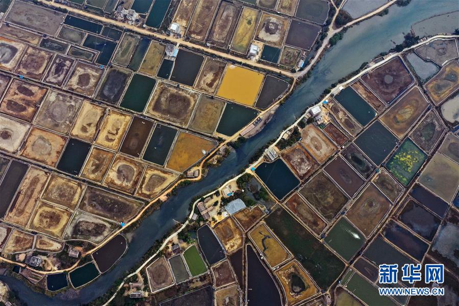 12月21日無人機拍攝的廣西合浦縣黨江鎮(zhèn)更螺圍出海口的蝦塘。冬日,廣西廉州灣海域風光別致。新華社記者張愛林攝