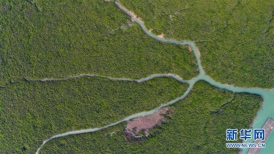 12月21日無人機拍攝的廣西合浦縣黨江鎮(zhèn)更螺圍出海口一景。冬日,廣西廉州灣海域風光別致。新華社記者張愛林攝