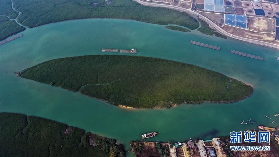 12月21日無人機拍攝的廣西合浦縣黨江鎮(zhèn)更螺圍出海口一景。冬日,廣西廉州灣海域風光別致。新華社記者張愛林攝