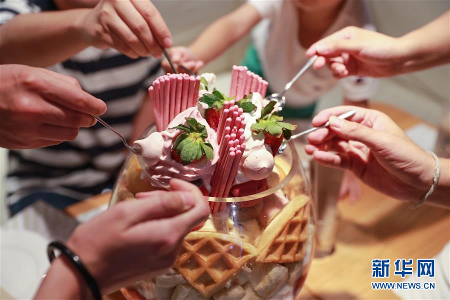 2019年7月28日,在泰國曼谷,顧客在一家冰淇淋店分享冰淇淋。這家冰淇淋店因為其超大款的冰淇淋走紅網(wǎng)絡(luò),吸引許多游客前去拍照打卡。 新華社記者 張可任 攝