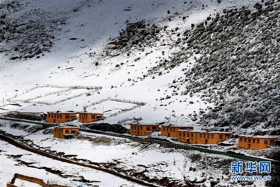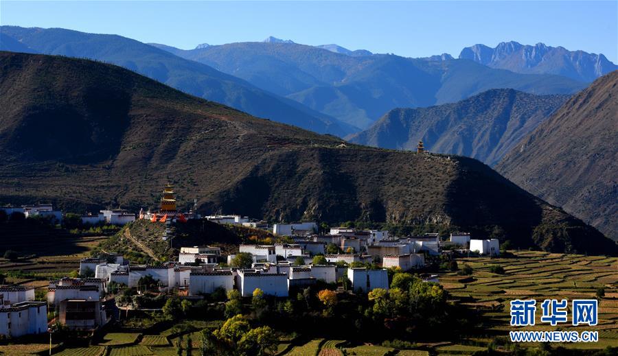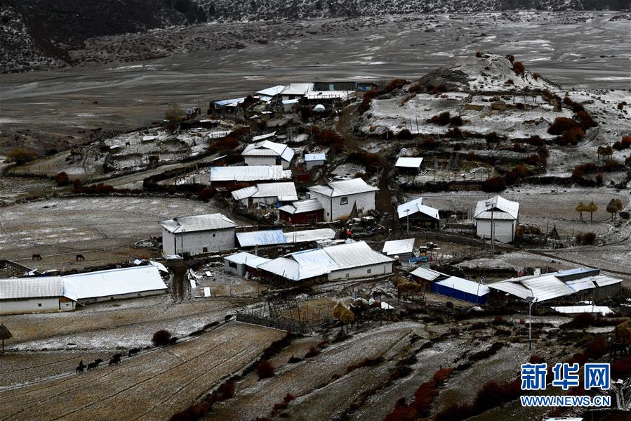 川藏線四川甘孜縣境內的雪山和民居(11月3日攝)。新華社記者陳天湖攝