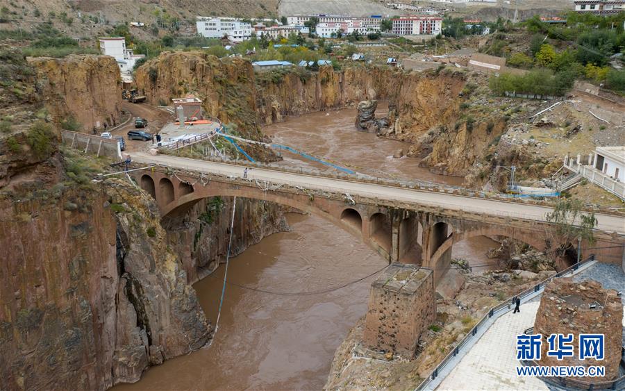 在西藏八宿的怒江大橋旁矗立著一座橋墩(10月23日攝)。據(jù)十八軍后人介紹,工兵5團一位戰(zhàn)士修橋時過于疲憊,不慎掉入了正在澆注的橋墩中,成了永遠的紀念碑。新華社記者江宏景攝