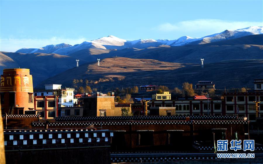 川藏線四川甘孜縣境內的雪山、白塔和民居(11月3日攝)。新華社記者陳天湖攝