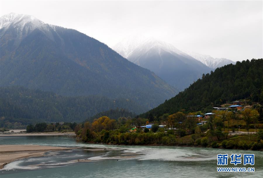 西藏波密縣境內古鄉(xiāng)湖畔的雪山、彩林和民居(10月25日攝)。新華社記者陳天湖攝