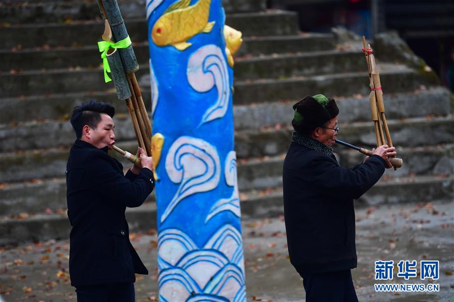 在烏英苗寨新蘆笙柱下,融水苗族自治縣苗族蘆笙音樂(lè)代表性傳承人梁安合(右)在練習(xí)吹蘆笙(12月24日攝)。新華社記者王諾攝