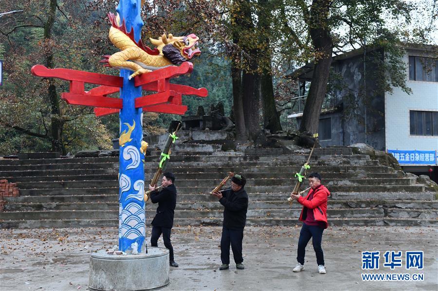 在烏英苗寨新蘆笙柱下,融水苗族自治縣苗族蘆笙音樂代表性傳承人梁安合(中)在練習吹蘆笙(12月24日攝)。新華社記者王諾攝
