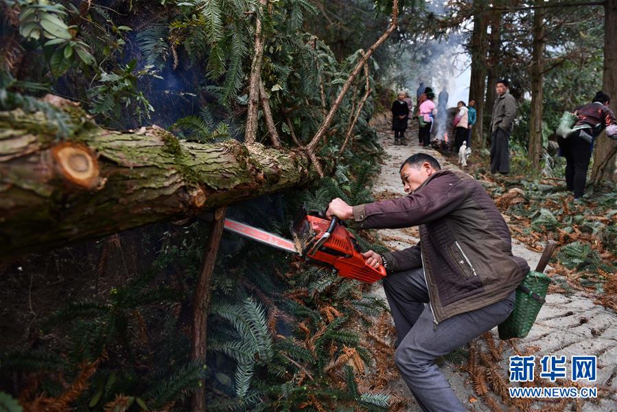烏英苗寨村民在鋸木頭,準備制作蘆笙柱(12月2日攝)。新華社記者黃孝邦攝