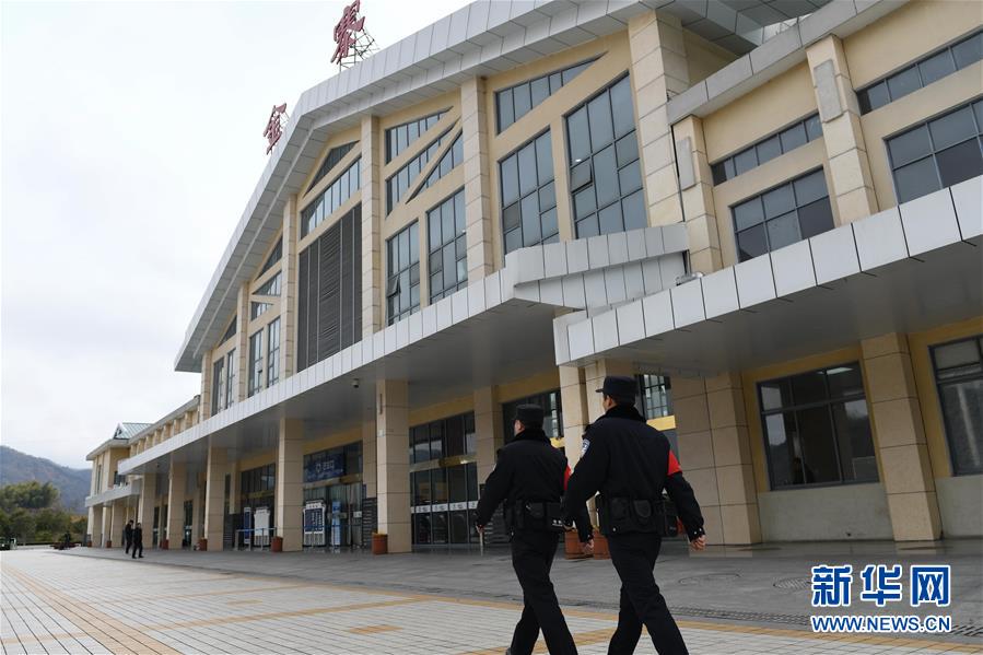 金寨火車站派出所民警何津超(左)和王晨旭在站前廣場執(zhí)勤(12月19日攝)。新華社記者張端攝