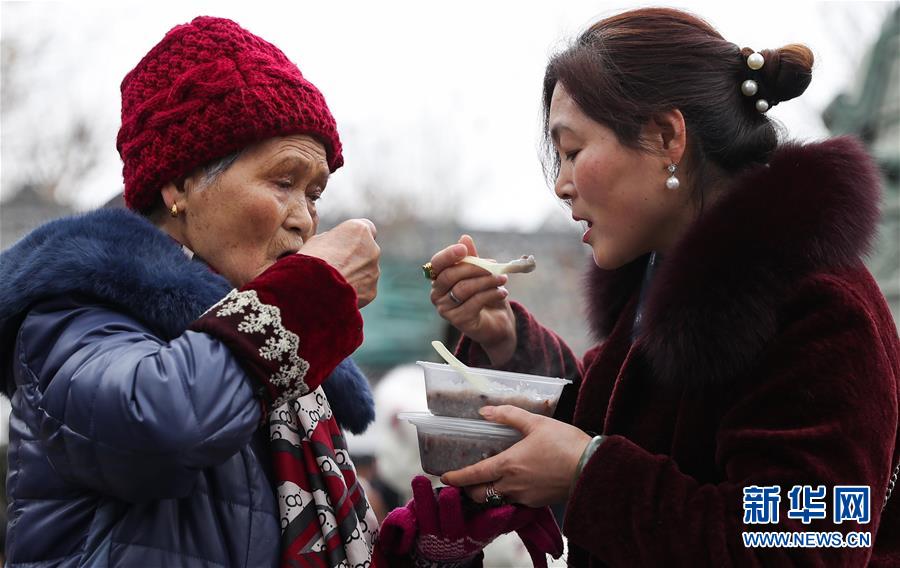1月2日,兩位市民在閬中古城貢院廣場吃臘八粥。 當(dāng)日是農(nóng)歷臘月初八臘八節(jié),四川閬中古城舉行“萬人同品臘八粥”活動,當(dāng)?shù)鼐用窈捅姸嘤慰驮谪曉簭V場免費享用臘八粥。 新華社記者 江宏景 攝