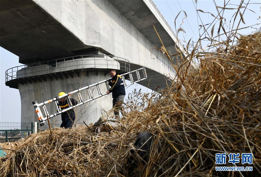1月3日,中國鐵路濟南局臨沂工務(wù)段工程技術(shù)員在沂河特大橋橋下搬運工具。新華社記者 朱崢攝