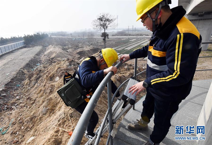 1月3日,中國鐵路濟南局臨沂工務(wù)段工程技術(shù)員李奔騰在沂河特大橋橋梁連接處檢查。新華社記者 朱崢攝