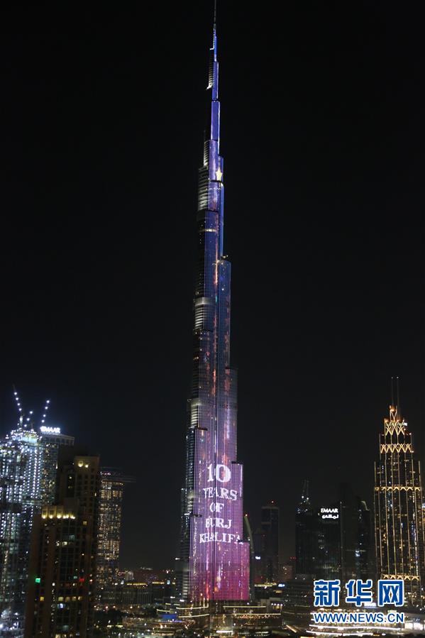 這是1月4日在阿聯(lián)酋迪拜拍攝的世界第一高樓哈利法塔慶祝開放10周年燈光秀。
