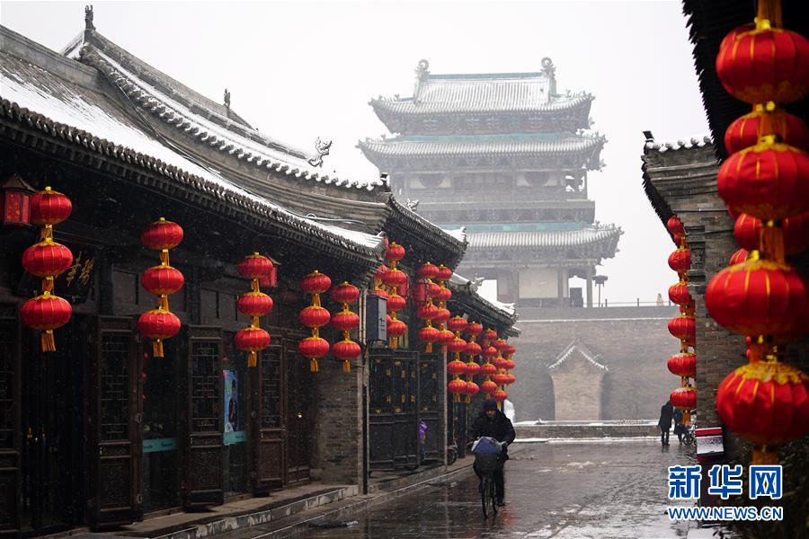 1月5日,一名行人在平遙古城街道上騎行。新華社記者詹彥攝