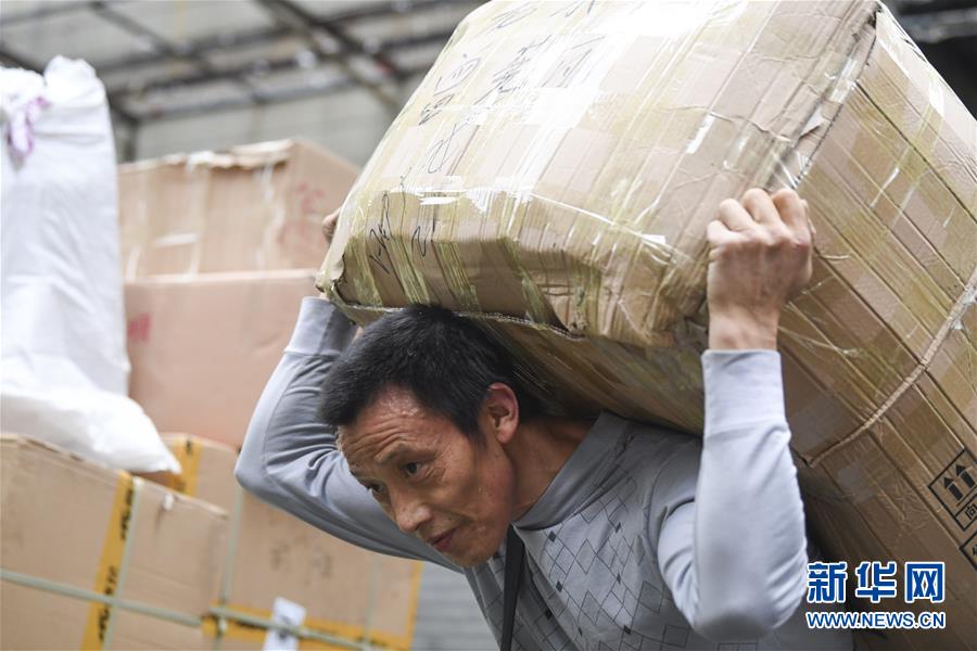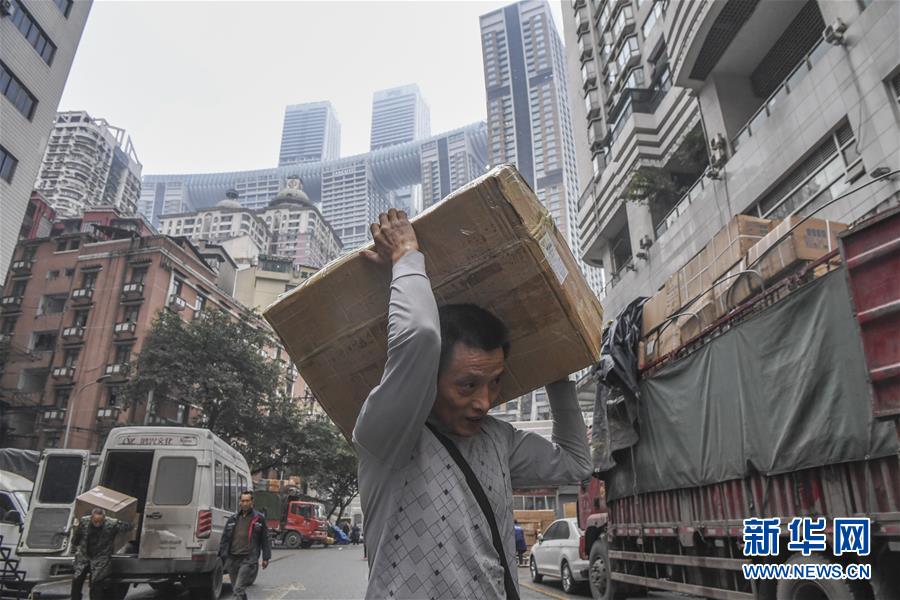 冉光輝在重慶朝天門大正商場內(nèi)搬運貨物(1月5日攝)。新華社記者王全超攝