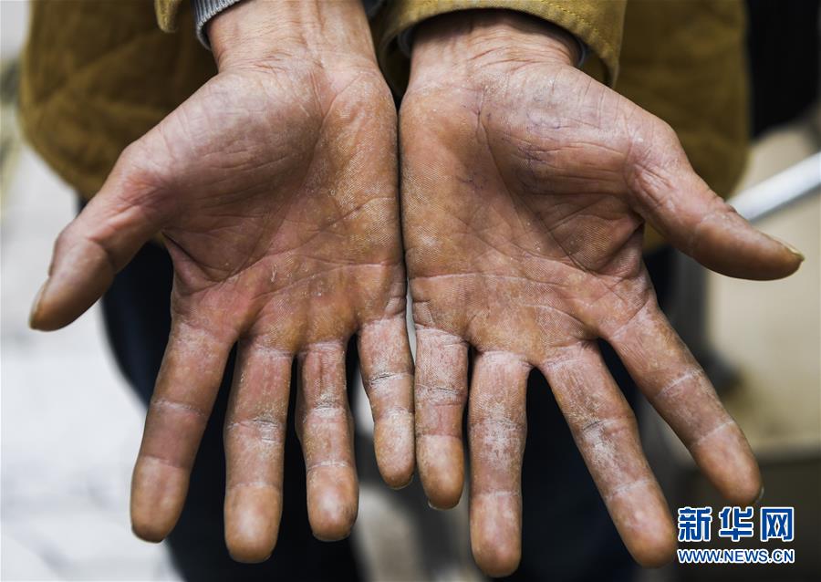 冉光輝展示自己的雙手(1月5日攝)。由于長期搬運重物,他的手磨出了不少老繭,指關節(jié)也有點變形。新華社記者王全超攝