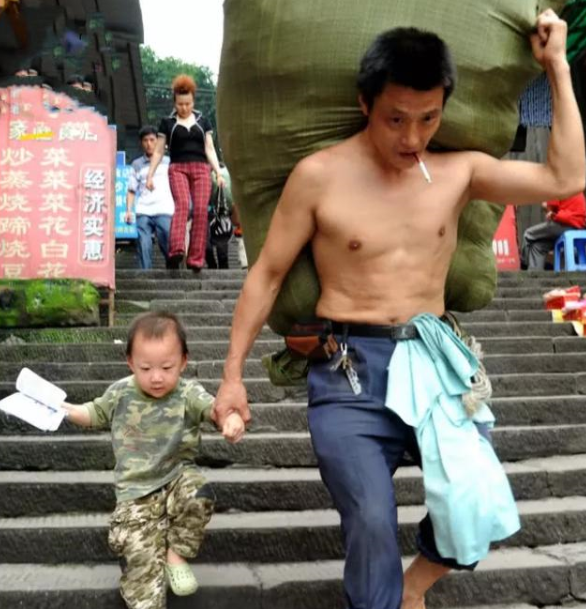 2010年,父親節(jié)那天,攝影師許康平在重慶用鏡頭拍攝下一對扛貨父子的照片。照片中的父親冉光輝扛著一大編織袋貨物,一手抓著袋子的一角,一手牽著時年只有三歲的兒子冉俊超,赤裸上身,踏著涼鞋,叼著香煙,從容淡定的走下梯坎。