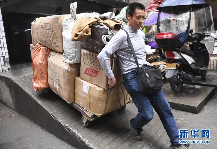 冉光輝用小板車(chē)載著貨物,從重慶朝天門(mén)大生商場(chǎng)出發(fā),前往發(fā)貨地點(diǎn)(1月5日攝)。新華社記者王全超攝