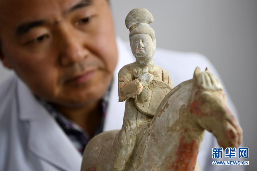 2019年12月27日,在天水市博物館文物保護修復(fù)中心陶、玉石器文物修復(fù)室,專業(yè)技術(shù)人員孟旭輝在觀察一件唐代彩繪陶俑的病害情況。 甘肅省天水市博物館文物保護修復(fù)中心有一支專業(yè)的文物修復(fù)隊伍,共有14名專業(yè)技術(shù)人員。從2012年正式成立以來,他們不僅承擔(dān)著對館藏和館外文物的修復(fù)工作,還參與了多次文化遺存的調(diào)查和搶救性發(fā)掘、古建筑彩畫保護、古墓葬搬遷復(fù)原等工作。一件件殘缺破損、滿身病害的文物經(jīng)過他們的巧手修復(fù),又重新煥發(fā)光彩,展示在公眾面前。 新華社記者 馬寧 攝