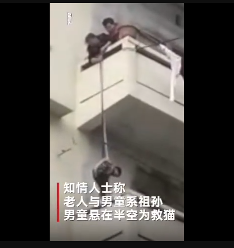 小男孩被大人們用繩子系著腰,晃晃悠悠地吊下三樓遮雨平臺后,勇敢地走向貓,將其抱起,接著又被5樓的奶奶等人晃晃悠悠地吊起往上拉,小男孩全程表情木然,絲毫未見緊張害怕。萬幸的是,最終男孩平安并順利完成任務。