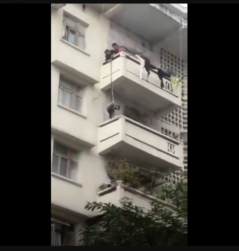 一只貓跑到了百順街老百貨公司宿舍樓三樓的窗戶遮雨臺上,被5樓的老太太發(fā)現,老太太善心發(fā)作,竟將孫子用繩子吊起,從5樓慢慢放至3樓救貓,整個過程不禁令人捏汗。