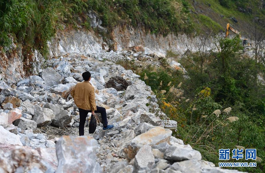 八好村駐村第一書記韋德徒步前往弄麻屯開展扶貧工作,弄麻屯的公路尚在建設(shè)當(dāng)中(2019年12月16日攝)。新華社記者黃孝邦攝