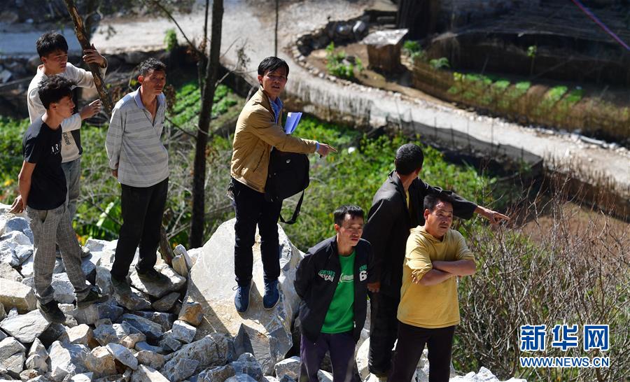 八好村駐村第一書記韋德王(中)在弄豪屯推進(jìn)水柜項(xiàng)目建設(shè)進(jìn)度(2019年12月16日攝)。新華社記者黃孝邦攝