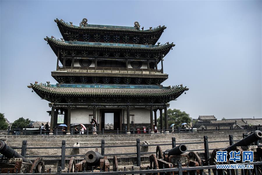 7月20日,游人在平遙南門城樓上游覽。