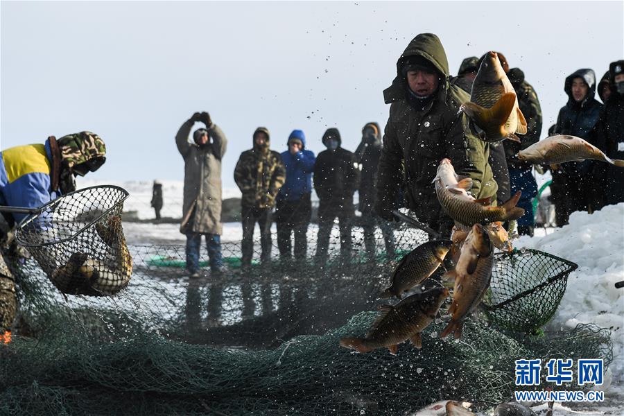12月18日,工作人員將冬捕魚打撈上岸。當(dāng)日,位于內(nèi)蒙古呼倫貝爾大草原上的諾干湖舉行冬捕活動,吸引不少游客前來觀看。冬日的諾干湖冰雪覆蓋,諾干湖冬捕也是當(dāng)?shù)囟韭糜蔚奶厣顒又?。新華社記者劉磊攝