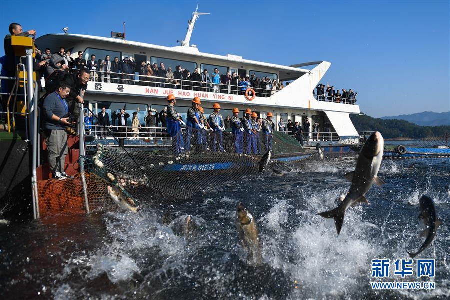 11月28日,游客在千島湖觀看巨網(wǎng)捕魚(yú)。新華社記者黃宗治攝