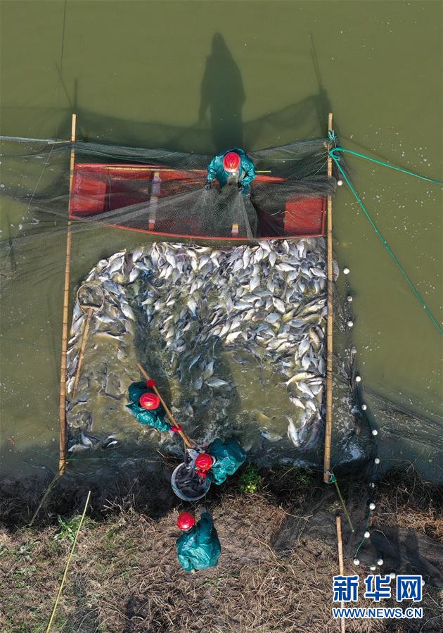 12月28日,漁民們?cè)诹夂?zhèn)盛江家庭農(nóng)場(chǎng)拉網(wǎng)捕魚(無(wú)人機(jī)拍攝)。新華社記者黃宗治攝