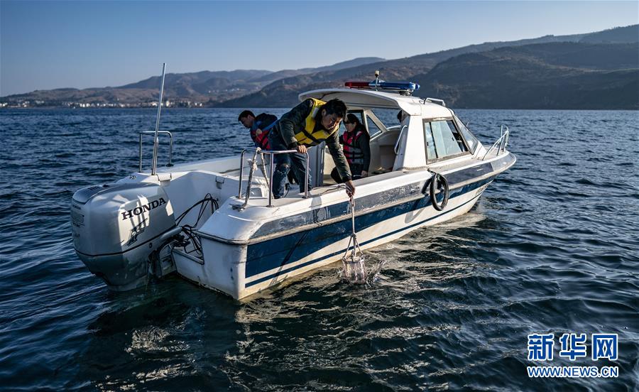 1月10日,云南省生態(tài)環(huán)境科學研究院的工作人員在撫仙湖取樣,進行月度水質(zhì)監(jiān)測。 新華社記者 江文耀 攝