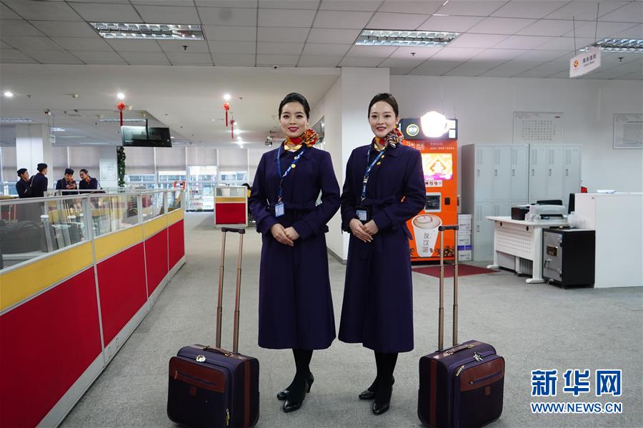 1月10日,天津航空乘務(wù)員付紅宇(左)和同事陶鑫鑫準(zhǔn)備前往機場。新華社記者王暉攝