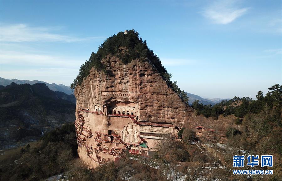 12月26日無人機(jī)拍攝的雪后晴空下的麥積山石窟。新華社記者馬寧攝
