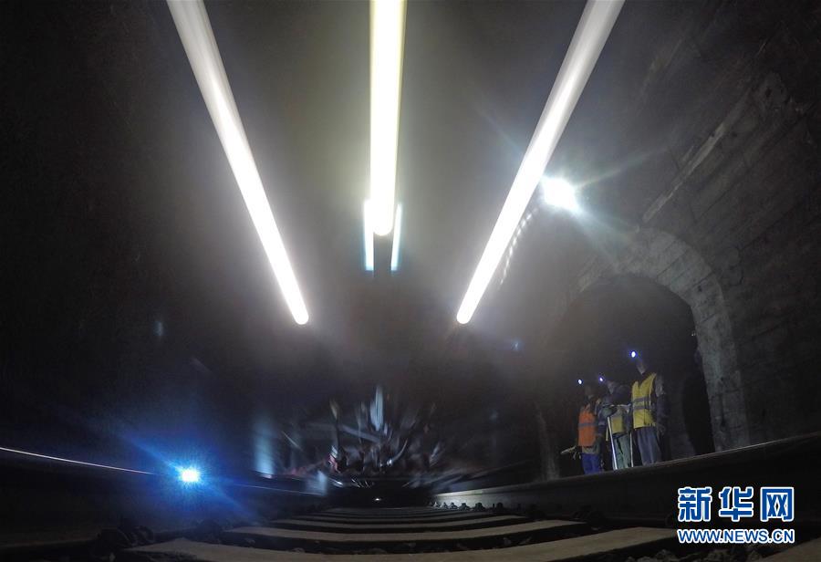 1月9日,在加格達(dá)奇工務(wù)段西羅奇嶺二號(hào)隧道,西羅奇維修工隊(duì)工作人員在避車(chē)洞內(nèi)躲避列車(chē)。新華社記者王毓國(guó)攝