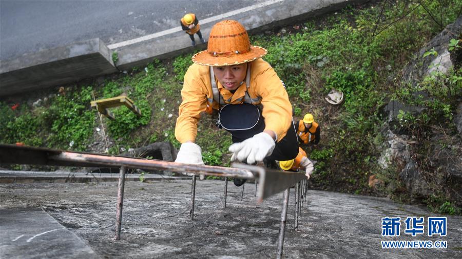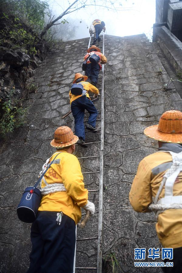1月14日,百色工務(wù)段白水河橋隧工區(qū)班組成員攀梯上山開展巡查工作。在中國鐵路南寧局集團公司百色工務(wù)段白水河橋隧工區(qū),有一個由14名工人組成的班組。他們常年像“爬山虎”一樣行走攀爬在地形險峻、云霧繚繞的高山上,負責(zé)南昆鐵路轄區(qū)路段的搜山掃石工作,清除一切可能危害鐵路行車安全的因素,保障旅客出行安全。新華社記者張愛林?jǐn)z