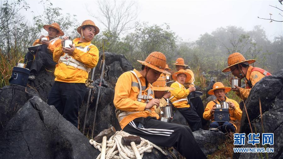 1月14日,百色工務(wù)段白水河橋隧工區(qū)班組成員在工作間隙吃午飯。在中國鐵路南寧局集團公司百色工務(wù)段白水河橋隧工區(qū),有一個由14名工人組成的班組。他們常年像“爬山虎”一樣行走攀爬在地形險峻、云霧繚繞的高山上,負責(zé)南昆鐵路轄區(qū)路段的搜山掃石工作,清除一切可能危害鐵路行車安全的因素,保障旅客出行安全。新華社記者張愛林?jǐn)z