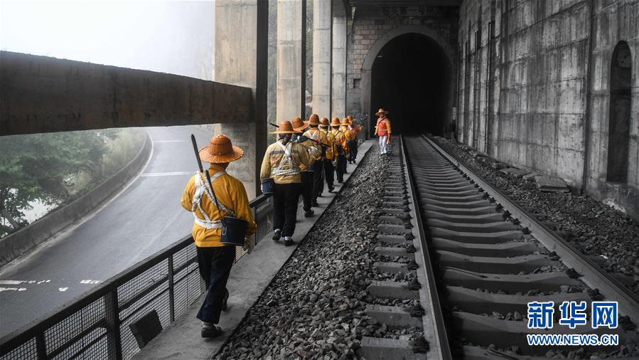 1月14日,百色工務(wù)段白水河橋隧工區(qū)班組成員開展巡查工作。在中國鐵路南寧局集團公司百色工務(wù)段白水河橋隧工區(qū),有一個由14名工人組成的班組。他們常年像“爬山虎”一樣行走攀爬在地形險峻、云霧繚繞的高山上,負責(zé)南昆鐵路轄區(qū)路段的搜山掃石工作,清除一切可能危害鐵路行車安全的因素,保障旅客出行安全。新華社記者張愛林?jǐn)z